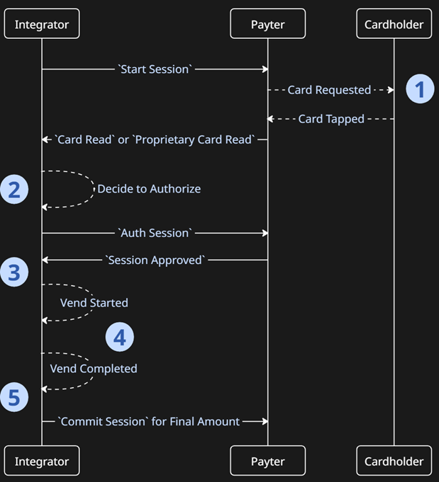 In this web sequence diagram, Payter details the core flow of an EMV payment which is successfully authorized, and later committed. In this case, the Committed amount is less than or equal to the Authorized amount, for simplicity.