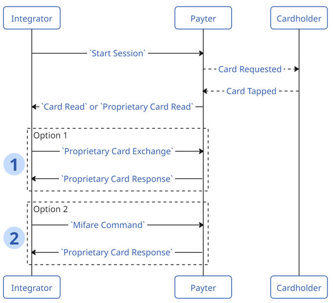 Proprietary Card Exchangeis used to send data to the card e.g. a Command Application Protocol Data Unit (CAPDU).Mifare Commandis used to read or write data to a Mifare card.