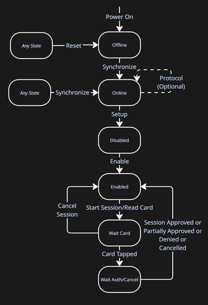 Enabled | The terminal is ready to use - commands such as Start Session or Read Card can be sent. | A Enable command must be sent while the terminal is in Disabled mode.This state can be achieved automatically following various commands as shown above. |